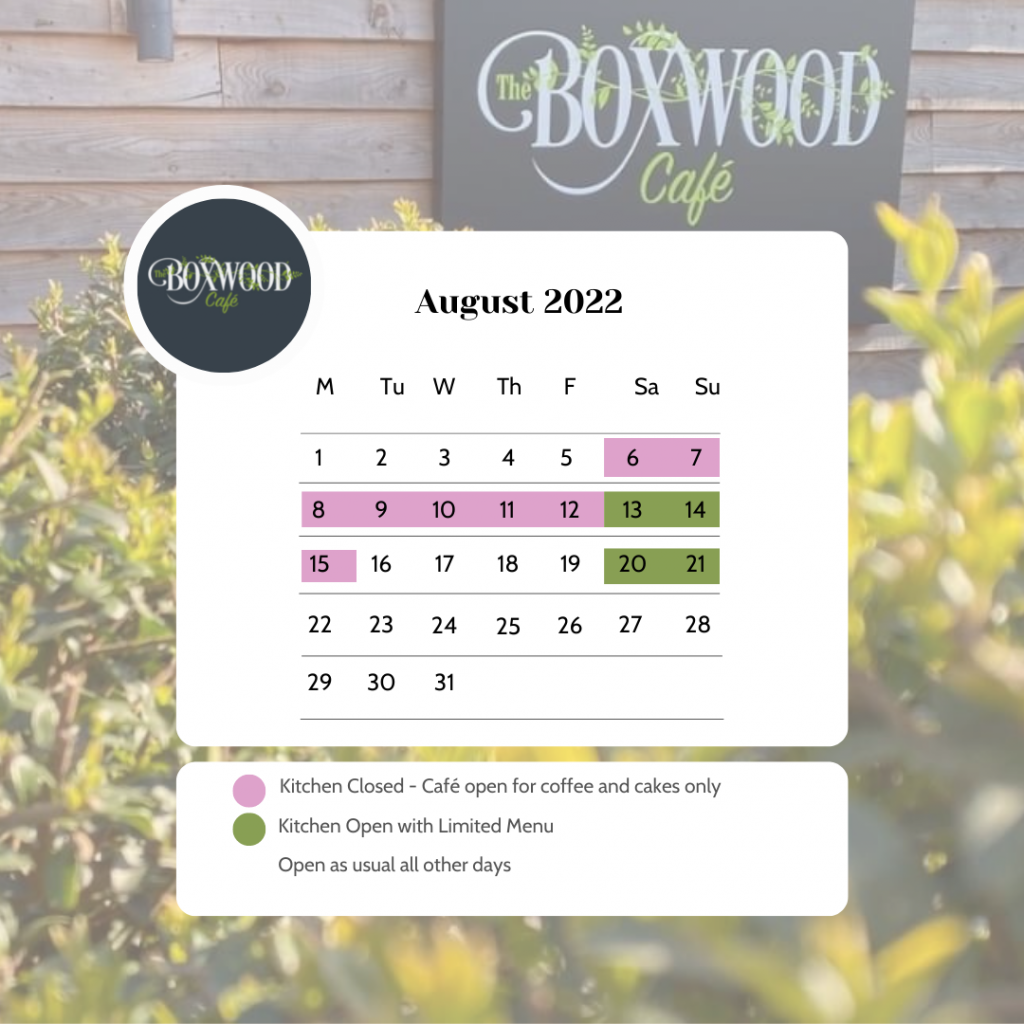 Please note that during August 2022, the kitchen of the Boxwood Café will be closed on some days, and over 2 weekends will be open but offering a limited menu. The Café will still be open on these dates for drinks and cakes. No food will be available made and served in the kitchen.